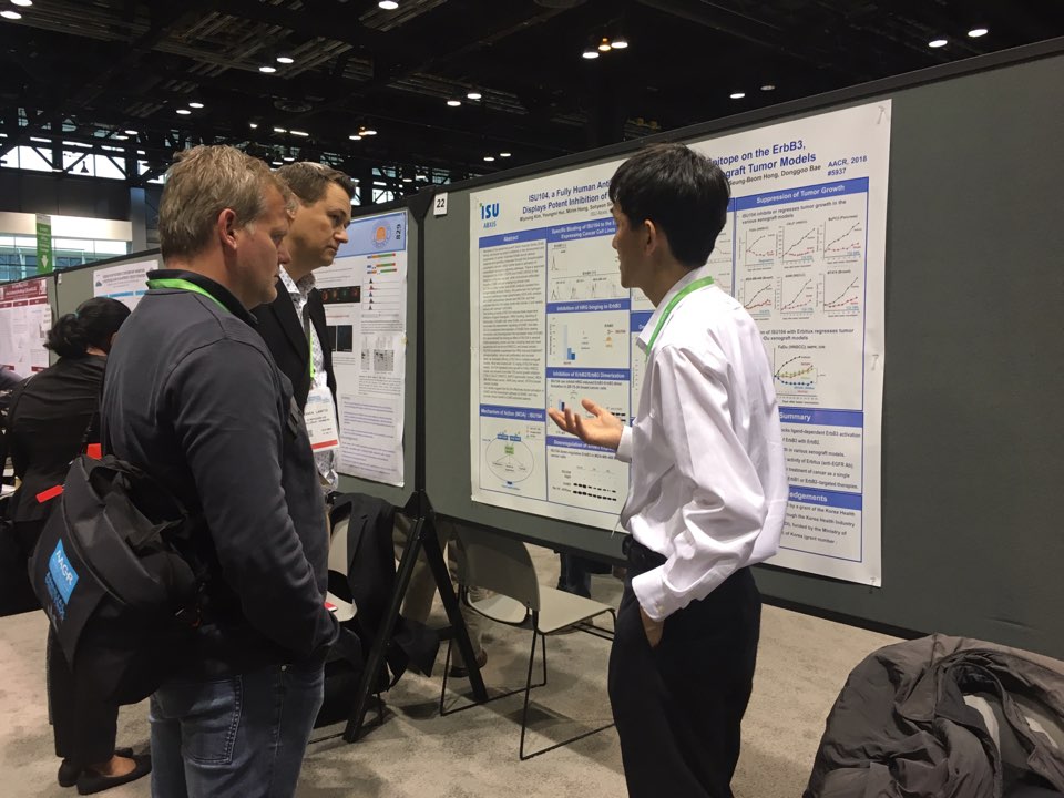 <사진=이수앱지스 홍승범 박사가 ‘2018 미국암연구협회 연례회의’에서 항암 신약 ‘ISU104’에 연구 결과에 대해 학회 참석자에게 설명하고 있다.>